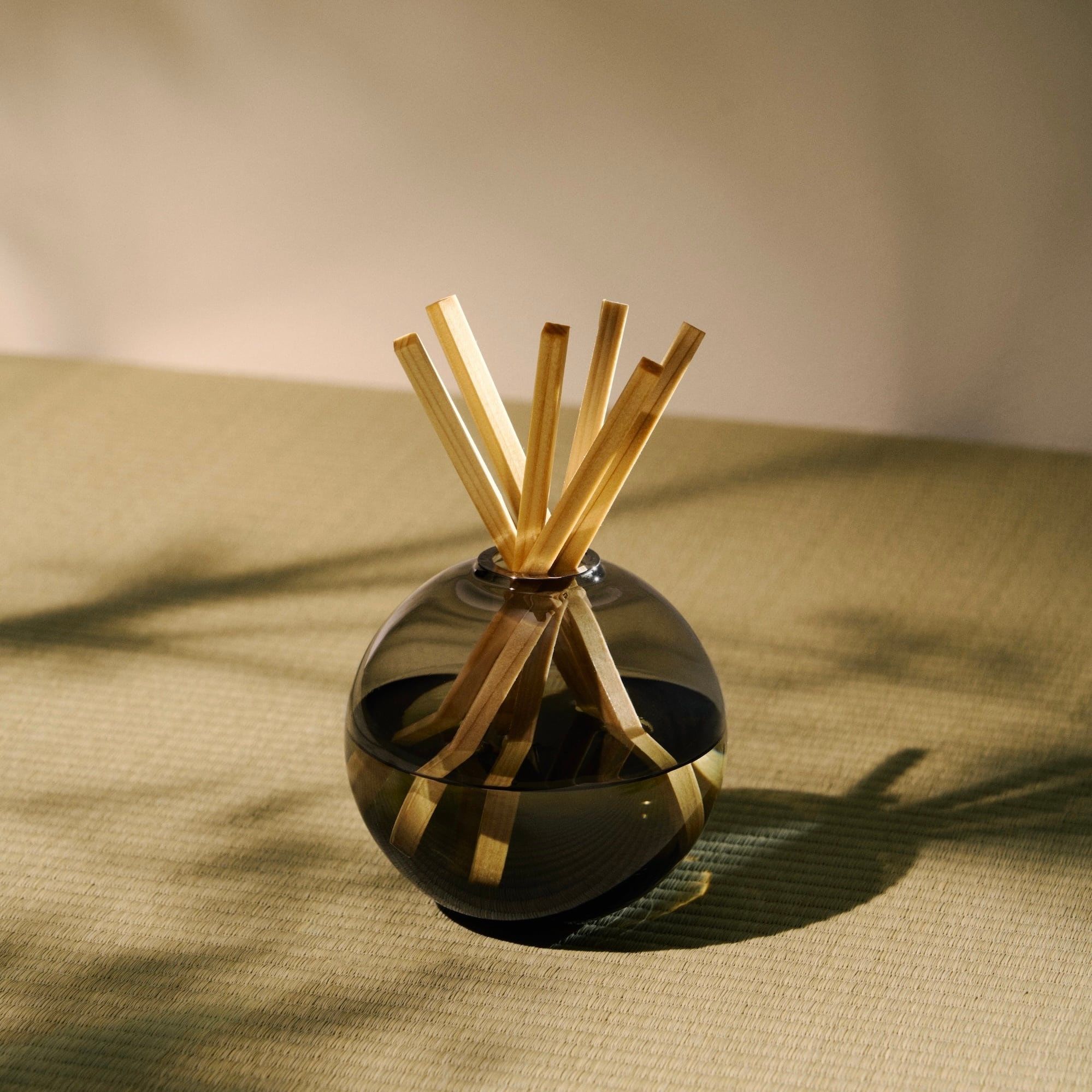 ディフューザーには8本の天然ヒノキリードスティックが付属され、約4〜5ヶ月間香りが持続します。空気の流れがあるところに置くと香りが広がりやすいです。